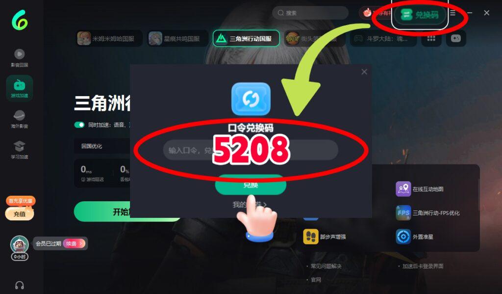 第三步:兌換流程:右上角**【兌換碼】-輸入【5208】-領取免費時長**!