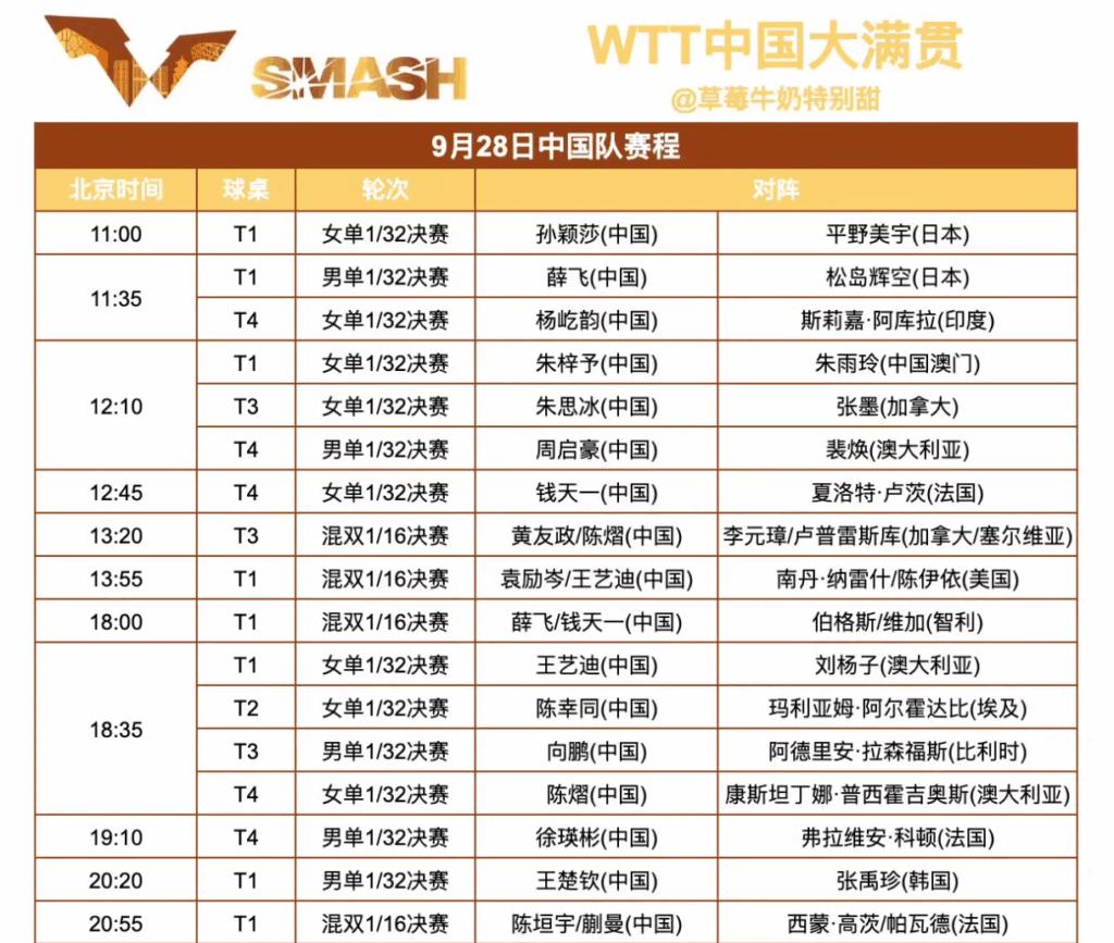 2025年9月28日,WTT中國大滿貫比賽迎來一系列精彩對決,以下係當日中國隊嘅賽程安排: