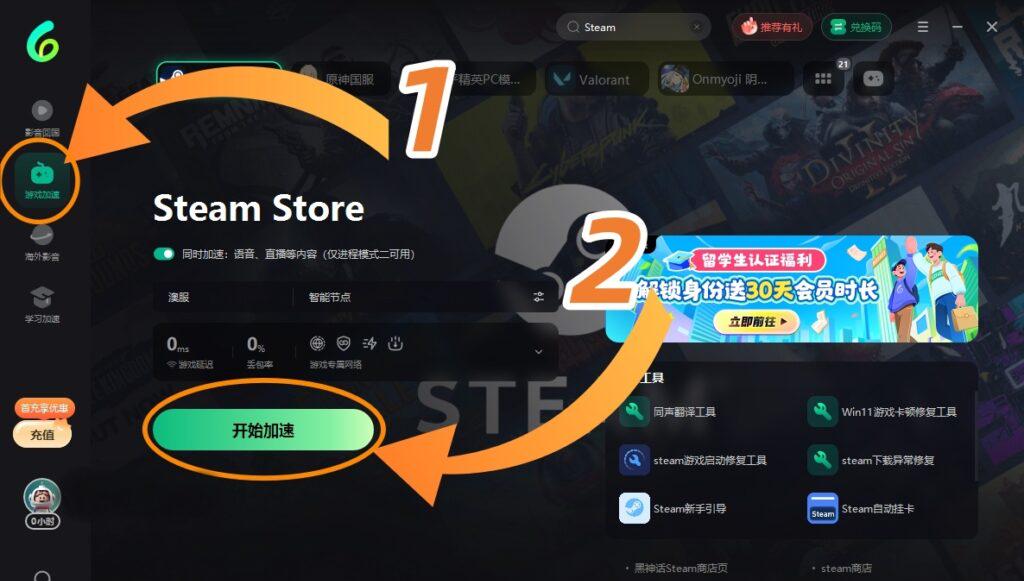 記得先兌換然後喺左邊搵到**【遊戲加速】-撳【開始加速】**節點揀國區,打開Steam,隨便買隻game,俾錢嘅時候國家地區揀🇨🇳大陸,支付成功之後,賬號就會自動轉咗