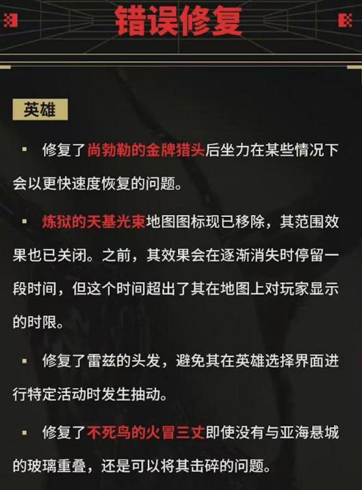 今次更新移除咗零嘅戰術監控嘅「視覺錯誤」,提升咗幻棱嘅時修羅場清晰度。同時我哋亦對玩法系統進行咗更新,並且修復咗部分錯誤問題。