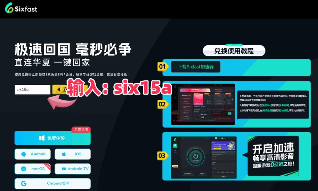 下載完成後按照提示登入註冊,喺會員中心搵到【兌換碼】,使用【six15a】先領取使用時長,先至可以使用軟件。亦都可以直接點擊:https://www.sixfast.com/tg-exchange 按照下圖所示填寫兌換碼【six15a】,並按照右邊步驟註冊登入Sixfast,領取使用時長。(支援手機同電腦)