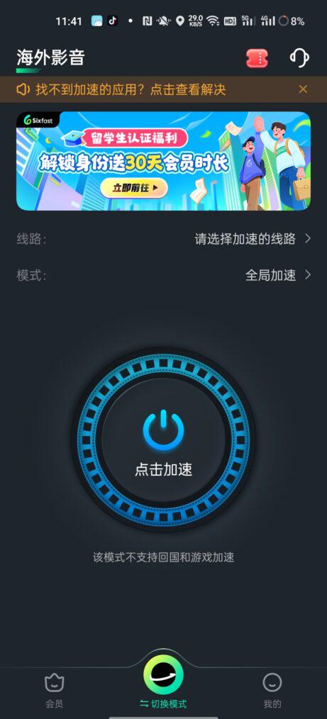 兌換完之後,下方切換模式,切換到【回國影音模式】進行加速