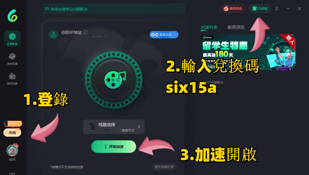 進行下載。下載好後按照提示登錄註冊,喺會員中找到【兌換碼】,使用【six15a】先領取時長,先至可以使用軟件,亦都可以直接點擊:https://www.sixfast.com/tg-exchange 按照下圖所示填寫兌換碼【six15a】,並按照右邊步驟註冊登錄Sixfast,領取時長。(支援手機同電腦)
