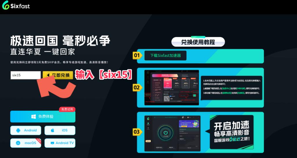 亦都可以直接點擊以下連結:https://www.sixfast.com/tg-exchange,按照下圖所示填寫兌換碼【six15】,並按照右邊步驟註冊登入Sixfast,領取使用時長。(支援手機同電腦)