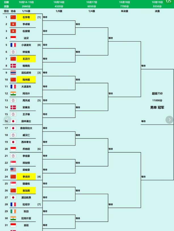 • 男單:石宇奇、李詩灃、翁泓陽、陸光祖、王正行五位選手攜手出戰,其中石宇奇同李詩灃具備衝擊頒獎台實力,佢哋將會面對丹麥本土名將安賽龍、印尼選手金廷等強手挑戰;
