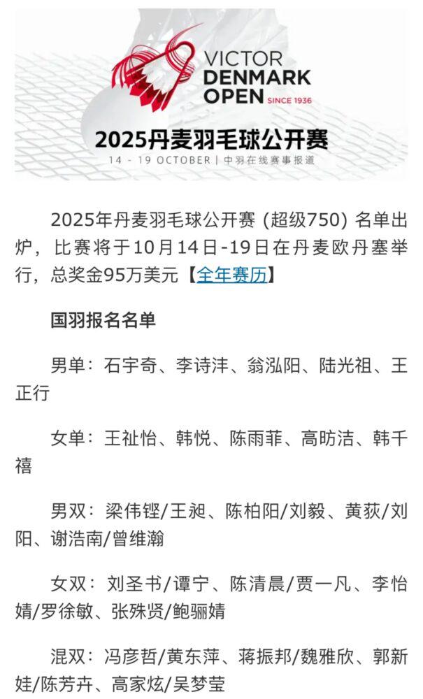 2025年世界羽聯巡迴賽歐洲賽季迎來重量級對決——VICTOR丹麥羽毛球公開賽已於10月14號至19號喺丹麥歐登塞嘅歐登塞體育公園(Odense Sports Park)正式開打。作為世界羽聯超級750級別賽事,今屆總獎金大幅提升至95萬美元,比起舊年增長咗11.8%,吸引全球頂尖羽毛球高手雲集。中國羽毛球隊派出最強陣容出征,34位選手將會喺男單、女單、男雙、女雙、混雙五個項目全力爭冠,賽事悠久歷史同高水平競技將會共同譜寫歐洲羽壇嘅金秋樂章。