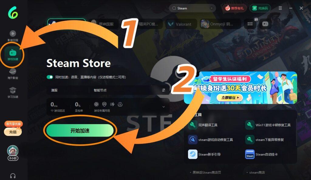 記得先兌換然後喺左邊搵到**【遊戲加速】-撳【開始加速】**節點選擇國區,打開Steam,隨便買隻遊戲,俾錢嘅時候國家地區選🇨🇳大陸,支付成功後,賬號就自動轉咗
