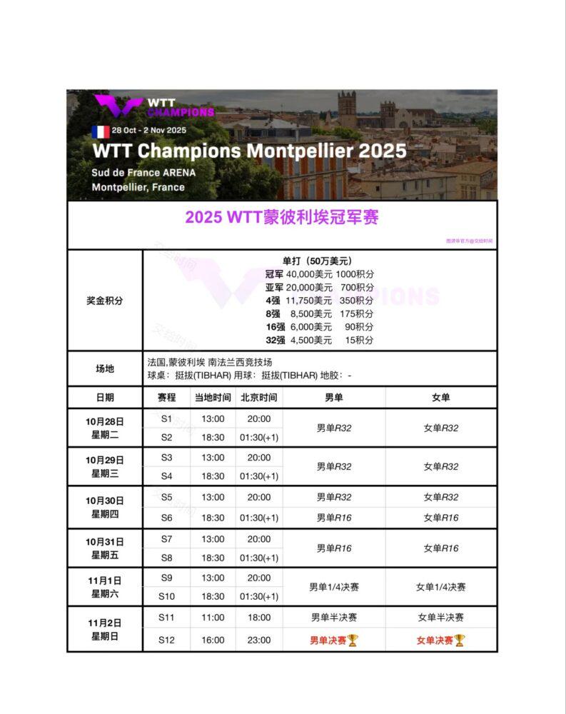 2025年WTT蒙彼利埃冠軍賽將會喺10月28號至11月2號喺法國蒙彼利埃嘅南法蘭西競技場熱烈開打。呢場賽事係WTT冠軍賽年度六站賽事中嘅第五站,亦都係今年倒數第二站重要巡迴賽。唔單止關乎選手爭取世界排名積分嘅關鍵時刻,更加因為舊年國乒意外輸咗波,令到今次賽事成為新奧運周期嘅「復仇之戰」,熱度同懸念都爆晒燈!