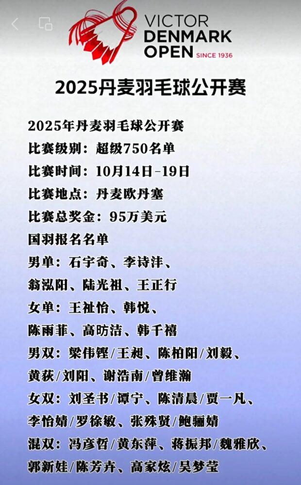 2025年丹麥羽毛球公開賽(Denmark Open 2025)作為世界羽聯巡迴賽體系中嘅重要一站,將於10月14號至19號喺丹麥歐登塞嘅Jyske Bank Arena(又叫做Arena Fyn)隆重舉行。賽事升級為超級750級別之後,無論係獎金規模定係參賽陣容都創下近年新高,成為年尾羽壇焦點賽事之一,直接影響選手年終總決賽嘅資格歸屬。