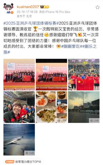 昨晚刷到蒯曼的微博时,我正在悉尼的公寓里煮泡面——手机屏幕上跳出她抱着奖杯的照片,配文写着「感谢姐姐们带飞」,底下那条「#2025亚洲乒乓球团体锦标赛#」的标签,突然让我想起上周和国内闺蜜视频时,她兴奋地说:「快去看《繁花》最新集!王家卫的镜头绝了!」而我只能无奈地回她:「姐,我这显示地区限制啊⋯⋯」