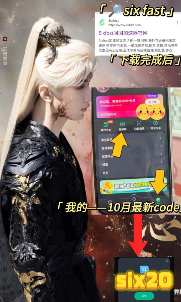 亦都可以直接點擊:https://www.sixfast.com/tg-exchange 按照下圖所示填寫兌換碼【six20】,並按照右邊步驟註冊登錄Sixfast,領取時長。(支援手機同電腦)