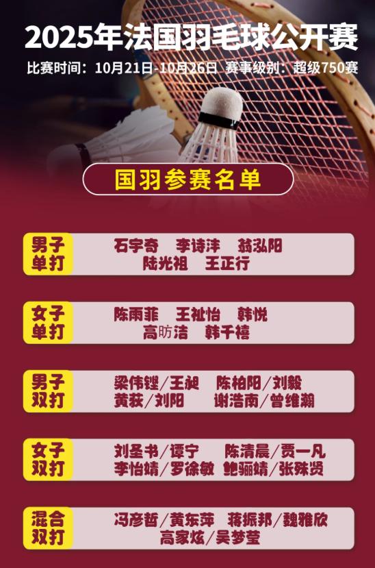 從歷史戰績睇,國羽喺法國公開賽表現穩健。2024年作為奧運測試賽,中國隊一舉奪得男單(石宇奇)、女雙(陳清晨/賈一凡)、混雙(馮彥哲/黃東萍)三項冠軍,展現咗強大嘅整體實力。2025年,陳清晨/賈一凡、鄭思維/黃雅瓊等主力組合依然係雙打項目嘅奪冠熱門,而男單選手石宇奇能否延續2024年擊敗昆拉武特嘅良好狀態,女單選手點樣挑戰安洗瑩、山口茜嘅統治地位,將會成為國羽賽事嘅核心睇點。