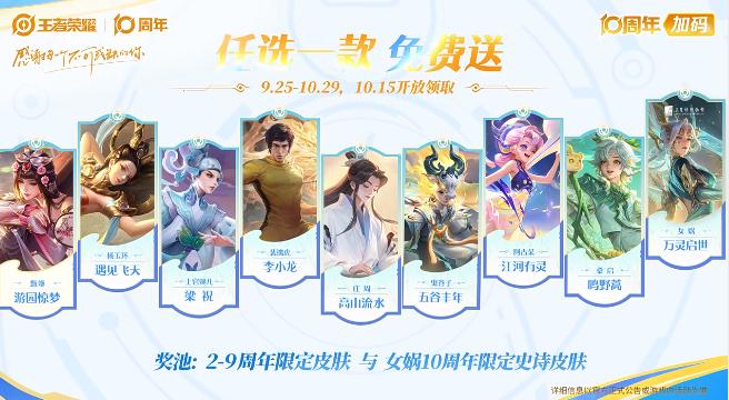 - 第一款:參與活動可免費兌換任一款2-9週年限定皮膚與10週年限定史詩皮膚