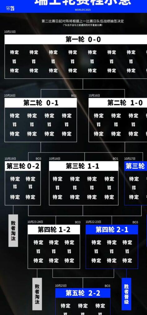 - 3-0積分組:前三輪全勝嘅隊伍將會喺第四輪展開對決,獲勝方直接以4-0嘅戰績鎖定淘汰賽席位,成為首批晉級八強嘅隊伍;敗方就會跌入2-1積分組,需要喺後續輪次繼續爭奪晉級機會。