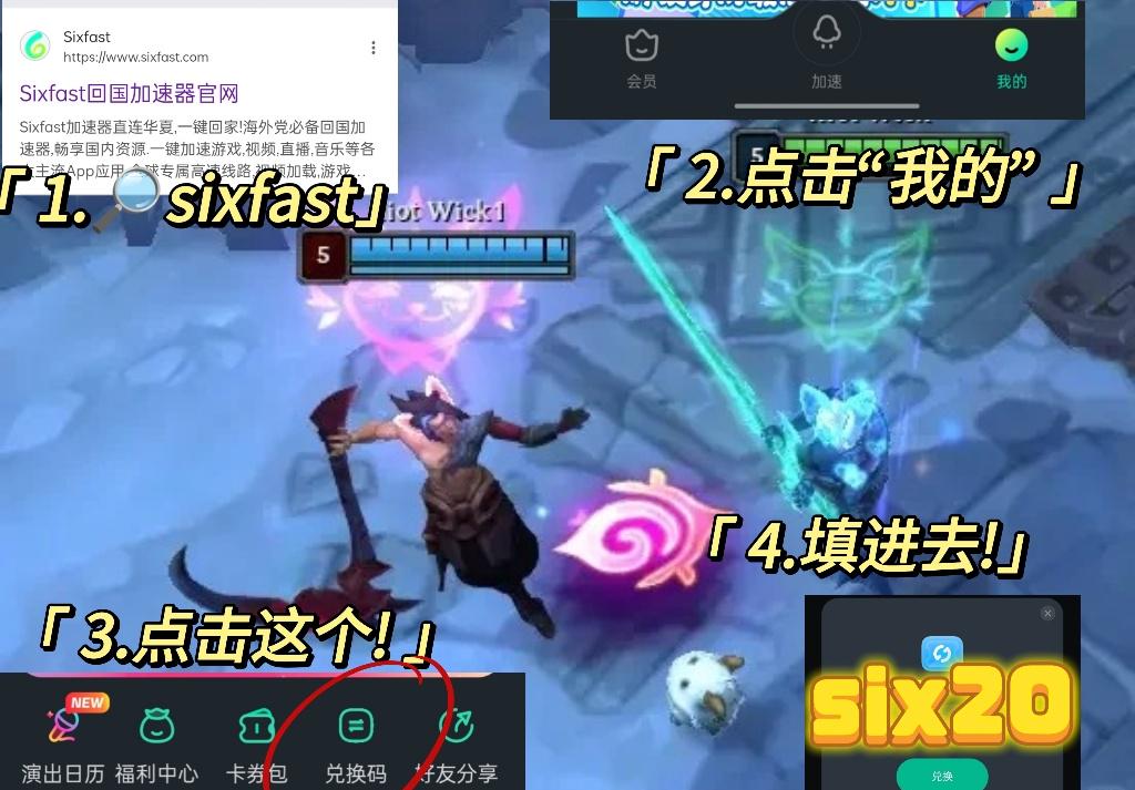 亦都可以直接點擊:https://www.sixfast.com/tg-exchange 按照下圖所示填寫兌換碼【six20】,並按照右邊步驟註冊登錄Sixfast,領取時長。(支援手機同電腦)