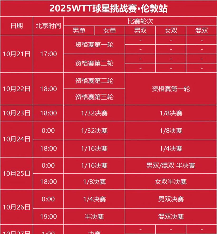 2025年WTT球星挑戰賽倫敦站(WTT Star Contender London 2025)作為WTT世界乒乓球職業大聯盟旗下嘅重要賽事,將於10月21日至26日喺英國倫敦銅箱體育館隆重舉行。呢個曾經見證2012年倫敦奧運會乒乓球賽事輝煌嘅場館,今次再次成為全球乒乓愛好者嘅焦點所在,7000個觀眾席位將會見證為期6日嘅巔峰對決。賽事設有男單、女單、男雙、女雙、混雙五個項目,總獎金高達30萬美元,單打冠軍仲可以獲得600點世界排名積分,對於選手嘅排名提升同奧運資格爭奪具有重要意義。