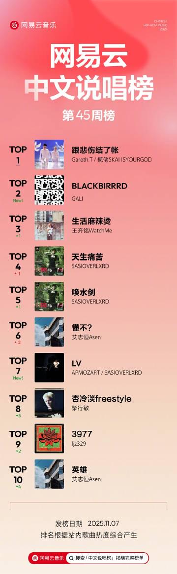 最近這週的中文說唱榜單可真是火熱啊!Gareth.T 和攬佬SKAIISYOURGOD 合作的《跟悲傷結了帳》直接衝上榜首,那種慵懶的旋律配上走心的歌詞,讓人忍不住循環播放。