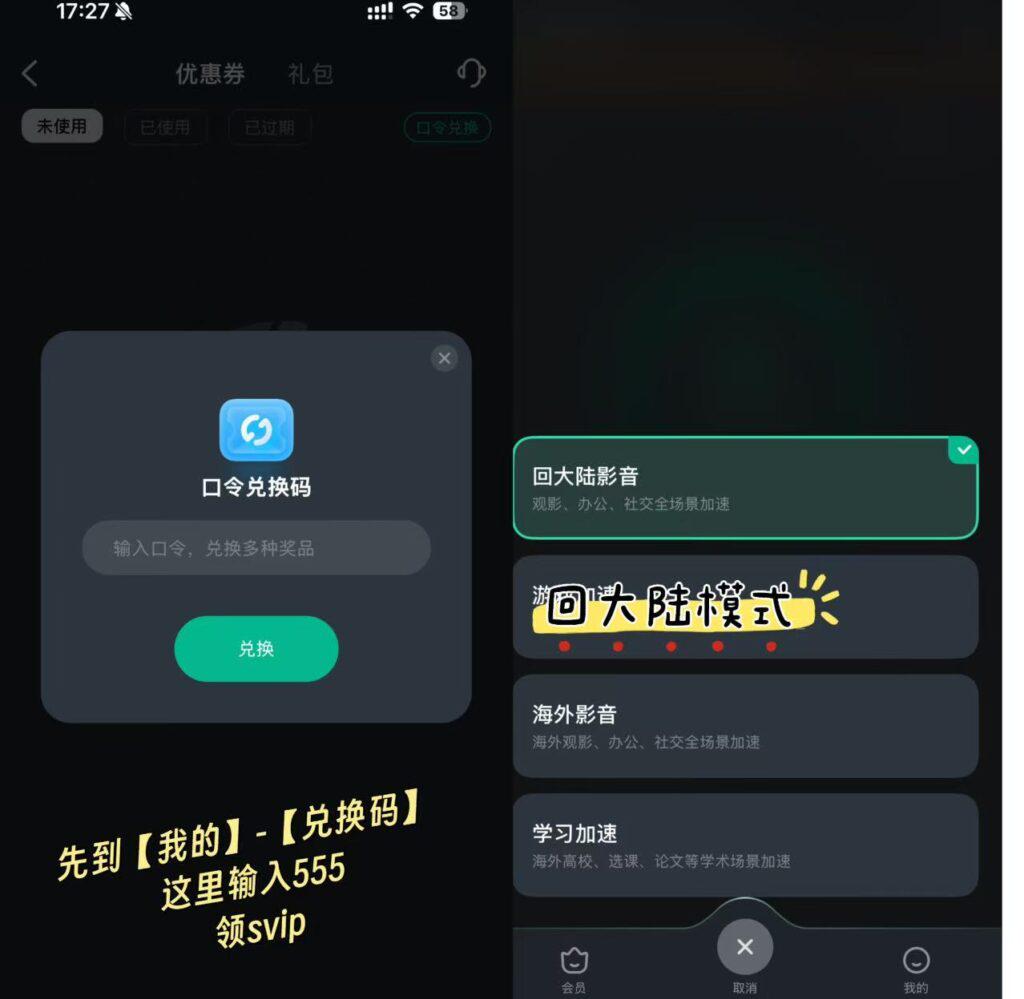 2、下載好後按照提示登錄註冊,喺會員中找到【兌換碼】,使用【six13yy】先領取時長,先至可以使用軟件,亦都可以直接點擊:https://www.sixfast.com/tg-exchange 按照下圖所示填寫兌換碼【six13yy】,並按照右邊步驟註冊登錄Sixfast,領取時長。(支持手機和電腦)