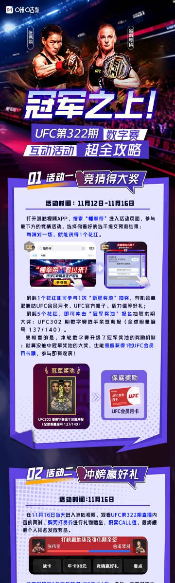 直播間的「衝榜贏好禮」更是誠意滿滿:衝進排行榜前三名直接送咪咕UFC會員年卡,若直播間互動值突破40萬,還能額外獲得UFC上海站地墊和張偉麗親簽周邊。這些限量商品在二手市場往往能炒到原價三倍以上。