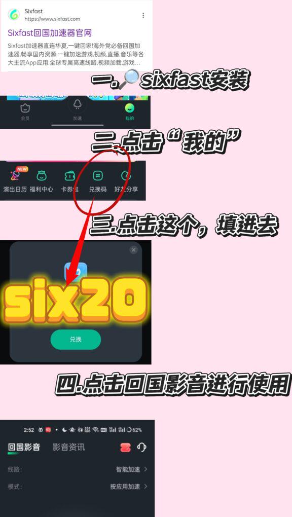 另外仲有一個更方便嘅方法:直接點擊呢個連結 https://www.sixfast.com/tg-exchange,按照下面圖片所示填寫兌換碼【six20】,然後跟住右邊嘅步驟註冊登入Sixfast,就可以成功領取使用時長。呢個方法同時支援手機同電腦使用,真係好方便!