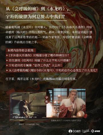說起《水龍吟》的音樂,不得不提幕後高手宇珩。這個名字你可能不太熟,但梁靜茹《會呼吸的痛》、李宇春《下個,路口,見》可都是她的作品。我表妹在加拿大留學時瘋狂迷戀這些歌,每次視訊都要抱怨:「為什麼QQ音樂在國外這麼難用!」