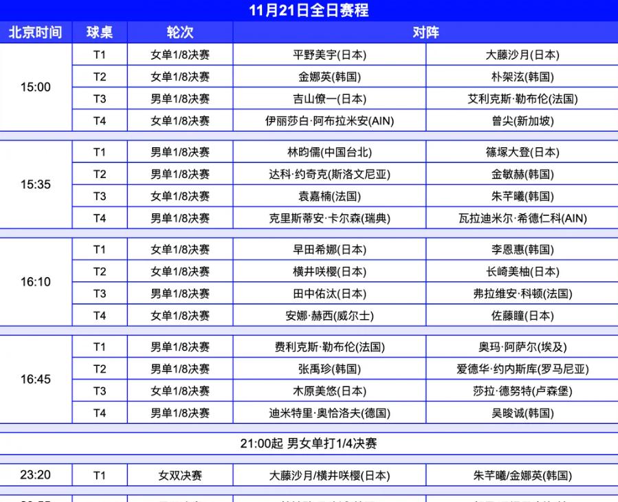 • 11月21日:男女單打1/8決賽、1/4決賽