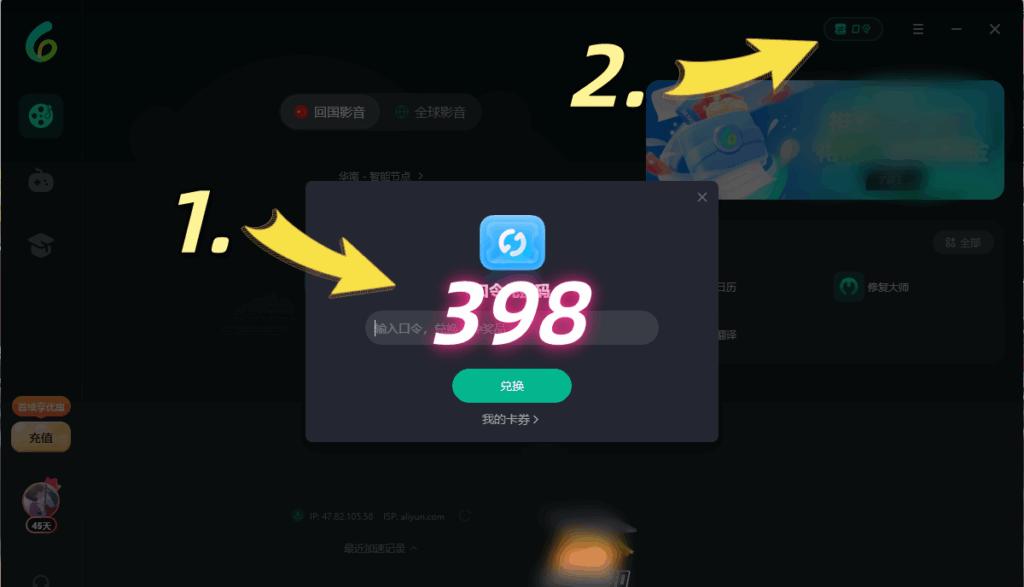第二步,右上角【兌換碼】-輸入兌換碼【398】-領取免費時長!兌換完成後先可以加速!!!