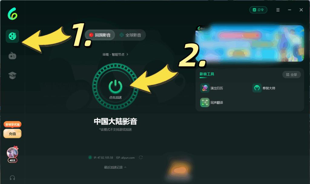 第三步,記得先兌換然後喺左邊搵到【影音回國】-點擊【開始加速】