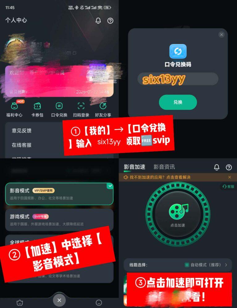 **2、下載完成之後,跟住提示註冊同登入。**然後去會員中心搵到【兌換碼】呢個功能,輸入專屬優惠碼【six13yy】嚟領取免費使用時長。記住啦,一定要先領取時長先至可以用到軟件嘅加速功能㗎!