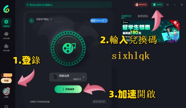 右上角【兌換碼】-> 輸入 【sixhlqk】 -> 領取免費時長!記住,要兌換完成之後先可以加速!兌換好之後,去左邊搵【遊戲模式】或者【影音翻牆】-> 點擊【開始加速】就搞掂。