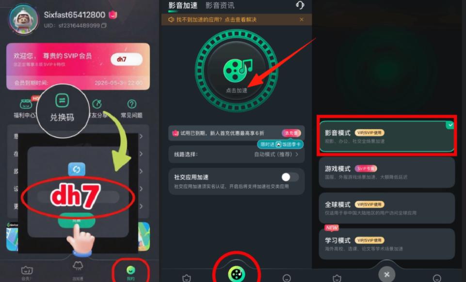 下載完成之後,跟住提示註冊同登入。然後去【我的】頁面,撳【兌換碼】,輸入呢個專屬碼:【dh7】,就可以即刻領取免費嘅加速時長,試用下係咪真係work!