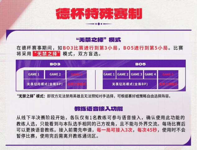1. 教練實時語音指導:由2026年1月1號嘅線下準決賽開始,每隊只准許1名教練接入比賽語音,每局可以申請3次、每次45秒嘅指導時間,而且比賽唔會暫停。接入語音嘅教練只可以睇到自己隊伍嘅視角,唔可以同外界溝通,咁樣既可以提升賽事嘅戰術博弈性,亦都可以俾觀眾解鎖「幕後指導」呢個全新視角,絕對係「戰術愛好者嘅福音」。值得留意嘅係,呢個規則同明年LCK、LEC聯賽嘅新規係一致嘅,今屆德杯亦都成為LPL戰隊適應新規嘅重要試煉場。