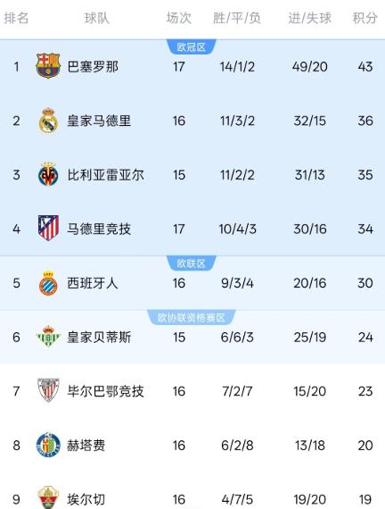 西甲第17輪過後,積分榜格局迎來顯著變動。爭冠集團方面,皇馬憑住呢場寶貴嘅作客勝利穩住局勢,雖然仍然落後榜首巴塞4分,但成功終止頹勢保住爭冠主動權;巴塞就憑藉之前嘅穩定發揮佔據榜首,後續賽程會直接面對同皇馬嘅「國家打吡」,呢場對決或者會直接決定半程冠軍誰屬。