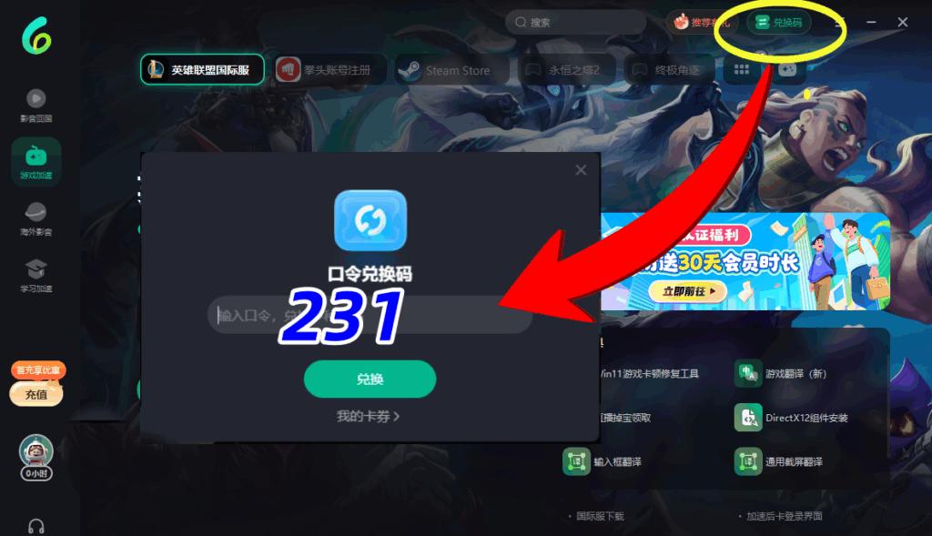 ① 喺界面搵到 【我的】 -> 【兌換碼】 -> 輸入兌換碼 【231】 -> 即可領取 免費 使用時長!