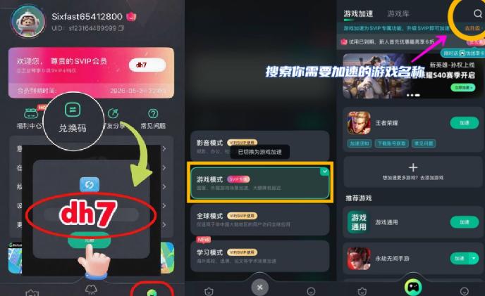 2. 下載好之後按照提示登錄註冊,喺客戶端右上角點擊【兌換碼】,輸入***【dh7】***就可以領取免費加速時長。