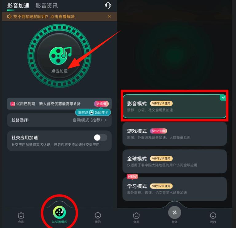 兌換完免費時長之後,就可以去下方切換加速模式。為咗流暢睇片,記得揀返【影音模式】,然後點擊加速,就可以暢通無阻咁欣賞愛奇藝體育嘅澳網直播啦!