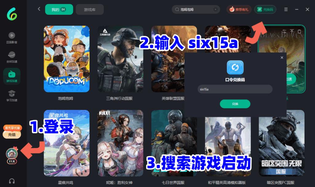 2.下載好後按照提示登入註冊,在【會員充值】中點選【卡卷兌換】,輸入【s012】即可領取免費加速時長。