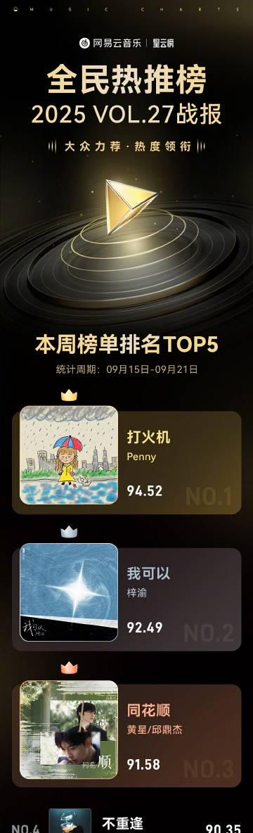 但你知道最破防的是什麼嗎?是那種「明明就在眼前卻摸不著」的失落感。就像這期網易雲熱推榜,Penny的《打火機》拿了冠軍,梓渝的《我可以》緊隨其後,每首歌下面都堆著幾萬條熱評:「單曲循環第38次」「考研黨的續命曲」。而我只能對著排行榜截圖猜旋律,像隔著玻璃窗看蛋糕店裡的草莓奶油塔。
