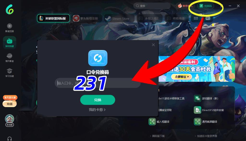 右上角**【兌換碼】-輸入【231】-領取免費**時長!兌換完成後先可以加速!!!