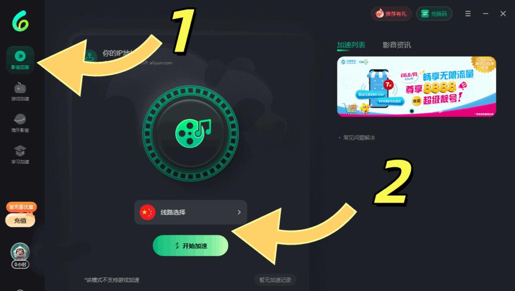 記得先兌換然後喺左邊找到**【影音返國】-點擊【開始加速】**
