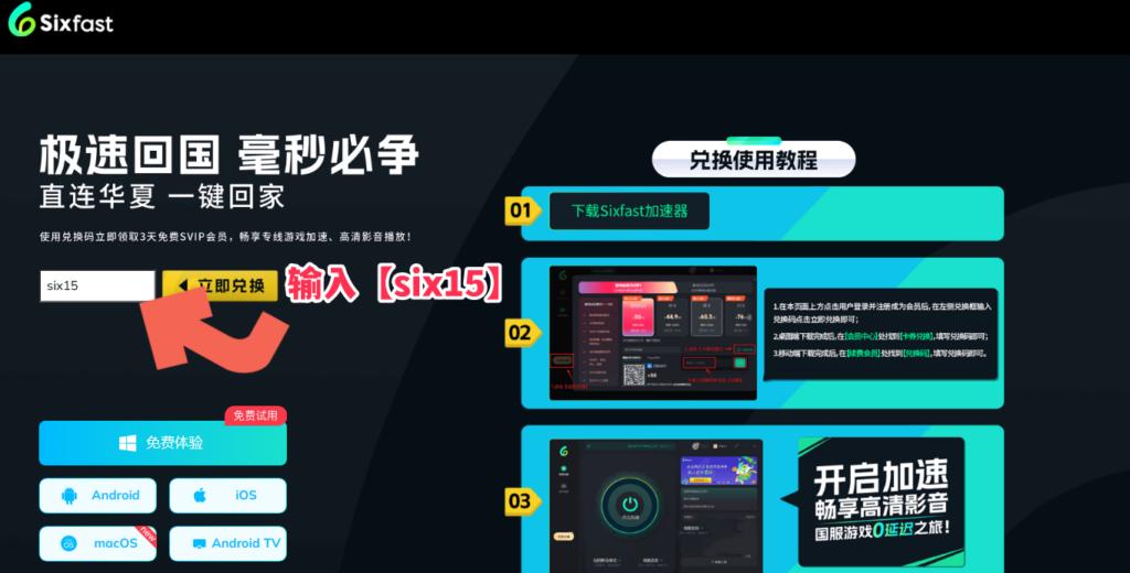 亦都可以直接點擊:https://www.sixfast.com/tg-exchange 按照下圖所示填寫兌換碼【six15】,並按照右邊步驟註冊登入Sixfast,領取時長。(支援手機同電腦)